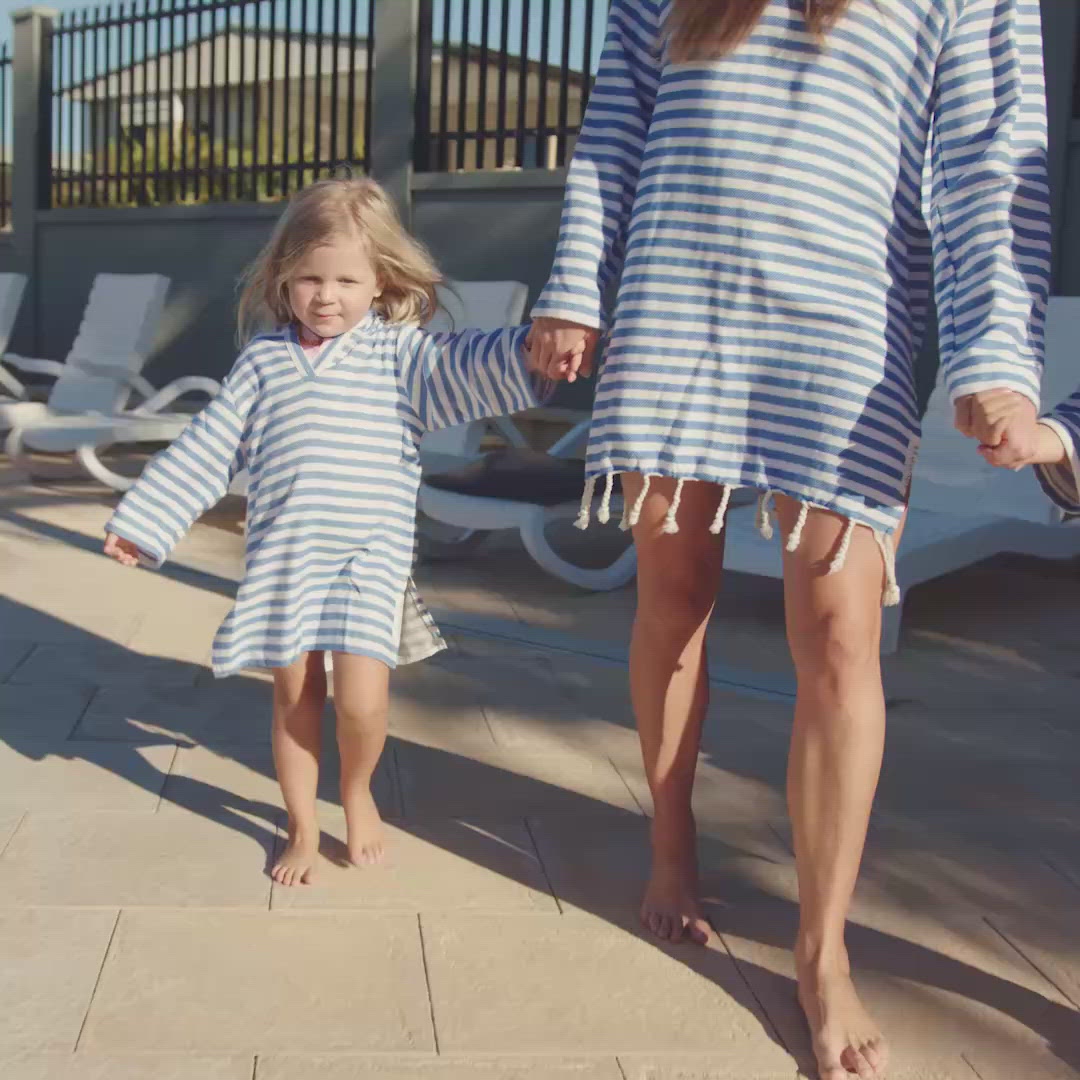 The AMALFI Adult Hooded Turkish Towel is a light Sundress, Swim Cover Up or Hooded Towel featuring twirled tassels. The AMALFI feels soft on your skin, it’s breathable and most of all lightweight. The relaxed design has a loose fit, yet its sophisticated shape makes it suitable for the beach, pool, or for a casual coffee at your local café. This is a Sundress & towel in ONE! Due to its characteristics the AMALFI is absorbent, yet dries quickly, so you can get out of the water and get on with your day.